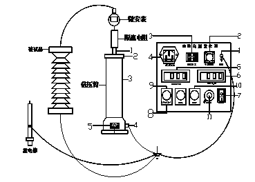 10.升壓至所需電壓或電流。升壓速度以每秒3—5kV試驗電壓為宜。對于大電容試品升壓時還需監(jiān)視電流表充電電流不超過試驗器的最大充電電流。對小電容試品如氧化鋅避雷器、磁吹避雷器等先升至所需電壓(電流)的95%,再緩慢仔細(xì)升至所需的電壓(電流)。然后從數(shù)顯表上讀出電壓(電流)值。如需對氧化鋅避雷器進(jìn)行0.75UDC—1mA測量時,先升至UDC1mA電壓值,然后按下黃色按鈕,此時電壓即降至原來的75%,并保持此狀態(tài)。此時可讀取電流。測量完畢后,調(diào)壓電位器逆時針回到零,按下綠色按鈕。需再次升壓時按紅色按鈕即可。