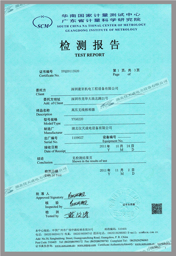 轉載:"YTC6220高壓無線核相器鑒定證書" 請注明來源于儀天成電力。 更多技術問題請致電儀天成電力客戶服務:027-87876585,技術部專線:027-87876585,在線客服:719388481